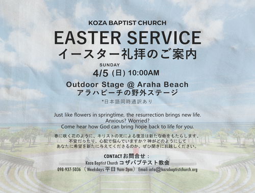 コザバプテスト教会は、生ける神を礼拝し、生き生きとした共同体につながり、自分の賜物を発見し、その賜物を神の栄光のために生かすことがきる場所です。